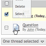 2. Die zweite Möglichkeit ist die Massenbearbeitung. Hierfür markieren Sie zunächst über die Checkboxen () die gewünschten Themen oder Beiträge. Wenn Sie beispielsweise fünf Themen markiert haben, finden Sie am Seitenende einen Button mit der Aufschrift »5 Themen markiert« und ebenfalls einen Pfeil. Mit einem Klick auf diesen Button öffnen Sie das Menü zur Bearbeitung aller markierten Themen. Gleiches gilt natürlich für die Beiträge.